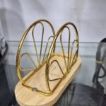 حامل خشبي ومعدني أنيق بتصميم ذهبي هندسي، مثالي لتنظيم المناديل أو الرسائل بأسلوب عصري.