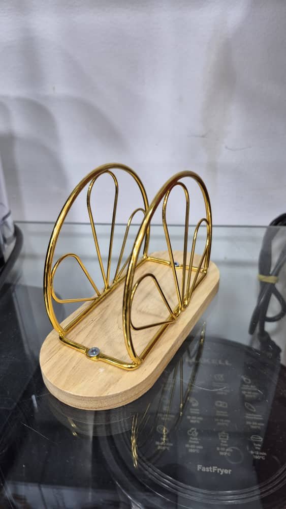 حامل أنيق متعدد الاستخدامات، يصلح لتنظيم المناديل أو الرسائل، مصنوع من قاعدة خشبية بيضاوية ناعمة تضيف لمسة دافئة إلى أي مساحة. يعلو القاعدة قوسان معدنيان نصف دائريين بلون ذهبي فاخر، مزخرفان بتصميم هندسي شبكي يمنح القطعة طابعاً عصرياً وفنياً. التثبيت يتم عبر مسامير معدنية لضمان الثبات والمتانة. يجمع هذا المنتج بين البساطة والذوق الرفيع، مما يجعله مثالياً للاستخدام في غرف المعيشة، المكاتب، أو حتى طاولات الطعام، حيث يضفي لمسة ديكور عملية وأنيقة في آنٍ واحد