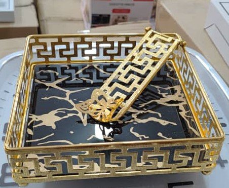 حامل مناديل فاخر بإطار ذهبي وزخارف فنية، يجمع بين الأناقة والوظيفة في قطعة ديكور مميزة.