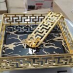 حامل مناديل فاخر بإطار ذهبي وزخارف فنية، يجمع بين الأناقة والوظيفة في قطعة ديكور مميزة.