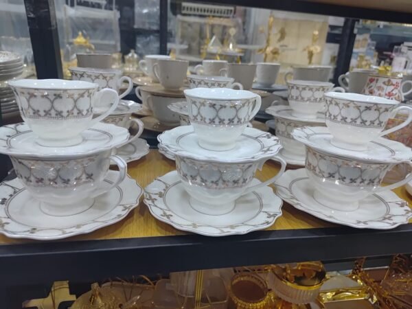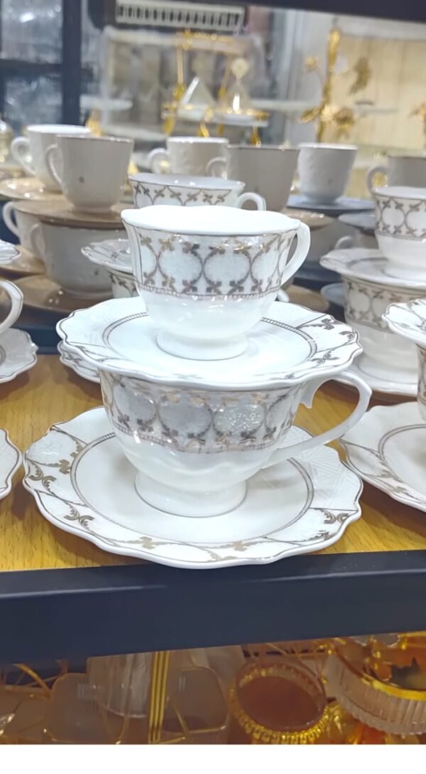 تصنع المجموعة من مواد عالية الجودة تضمن المتانة وطول الأمد. الطقم مكون من 24 قطعة متناسقة، تشمل أكواب وأطباق مثالية لتقديم المشروبات والأطعمة بأفضل شكل. اللون الأبيض الجذاب والمزين بلمسات ذهبية يضفي على المجموعة طابعًا فاخرًا يعزز من التجربة البصرية أثناء الاستخدام.