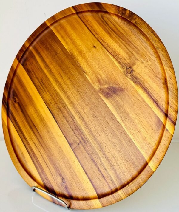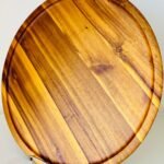 تميزي في مطبخك أو على مائدتك مع طبق التقديم الخشبي الدائري المصنوع من خشب طبيعي مصقول بعناية. يتميز الطبق بأخدود دائري محيطي يساعد على جمع السوائل أو الفتات، مما يجعله عملياً سواء للتقطيع أو التقديم.