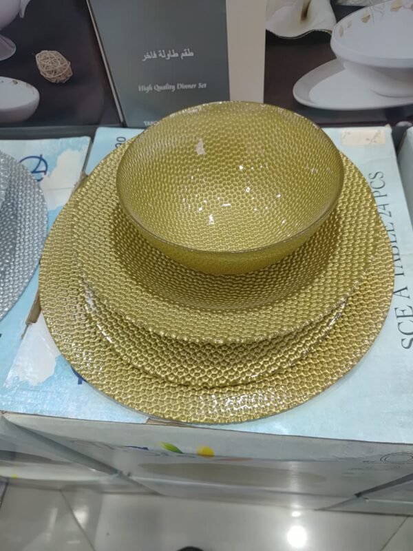 طقم سفرة فاخر بلون ذهبي لامع، يتميز بتصميم أنيق ونقشة بارزة تشبه خلايا النحل، تضفي عليه طابعاً ملكياً وفخامة استثنائية. يتكون الطقم من وعاء متوسط الحجم وصحنين بأحجام مختلفة، جميعها مصنوعة من مواد عالية الجودة بلمسة نهائية براقة تعكس الضوء بشكل جذاب. التصميم المتناسق يجمع بين الجمال والوظيفة، مما يجعله مثالياً للمناسبات الخاصة أو لتزيين طاولة الطعام بأسلوب راقٍ. يُعرض الطقم ضمن عبوة أنيقة تحمل شعار “طقم طاولة فاخر”، مما يعزز من قيمته كهدية مميزة لعشاق الذوق الرفيع.