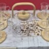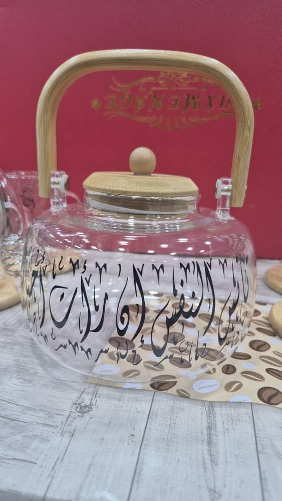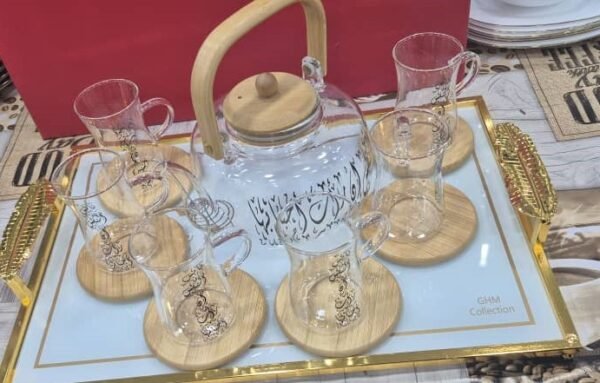 طقم شاي زجاجي أنيق مزخرف بالخط العربي، يضم إبريقاً وستة أكواب مع قواعد خشبية، مثالي للضيافة الراقية