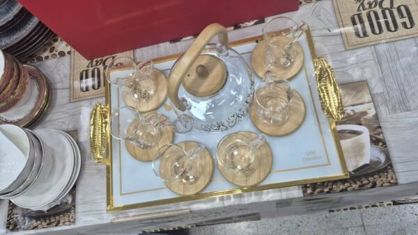 طقم شاي فاخر يجمع بين الأناقة العصرية واللمسة الثقافية الأصيلة، يتكون من إبريق شاي زجاجي شفاف بغطاء ومقبض خشبي أنيق، وستة أكواب شاي متناسقة مع قواعد خشبية دائرية. يتميز كل عنصر في الطقم بزخارف فنية من الخط العربي تضفي عليه طابعاً فريداً يعكس التراث العربي بروح حديثة. مثالي لتقديم الشاي في المناسبات الخاصة أو لإضفاء لمسة فنية على جلسات الضيافة اليومية. تصميمه الشفاف يبرز لون الشاي، بينما تضيف التفاصيل الخشبية دفئاً وأناقة للمظهر العام.