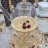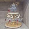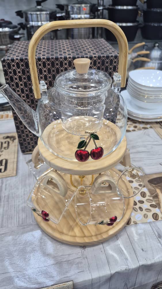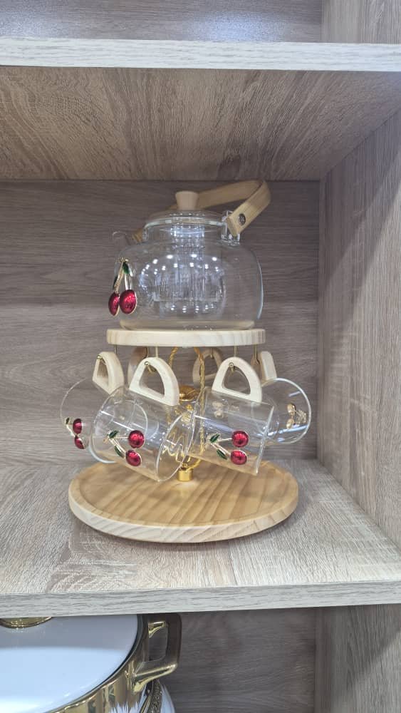 طقم شاي زجاجي أنيق يتكون من إبريق شاي وستة أكواب معلّقة على حامل خشبي دائري بتصميم عملي وجذاب. يتميز كل من الإبريق والأكواب بزخارف كرز حمراء وأوراق خضراء تضفي لمسة منعشة وحيوية على الطقم. الحامل الخشبي المصنوع بتشطيب طبيعي يضيف دفئاً وأناقة للمكان، ويجعل من هذا الطقم قطعة مثالية لتزيين المطبخ أو تقديم الشاي بأسلوب راقٍ في المناسبات الخاصة. تصميمه المتناسق يجمع بين الجمال والوظيفة، مما يجعله خياراً رائعاً لهواة الضيافة الأنيقة