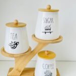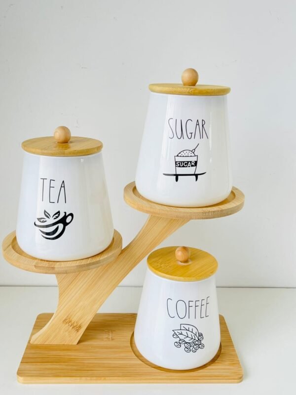طقم فاخر يتكون من ثلاث برطمانات سيراميك بيضاء مخصصة لحفظ الشاي، السكر، والقهوة، مزودة بأغطية خشبية طبيعية تضيف لمسة دفء وأناقة. كل برطمان يحمل ملصقًا واضحًا ورسمة توضيحية جذابة تعكس محتواه، مثل كوب شاي، وعاء سكر، وحبوب قهوة. البرطمانات مثبتة على حامل خشبي بتصميم متفرع فني يضفي لمسة ديكور فريدة على سطح المطبخ أو طاولة التقديم. مثالي لمحبي التنظيم الأنيق واللمسات الجمالية في أدوات المطبخ.