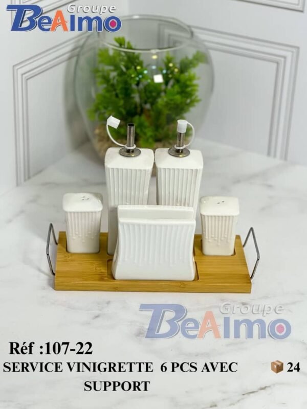 هذا الطقم الفاخر من Groupe BeAlmo يجمع بين العملية والأناقة ليضيف لمسة راقية إلى مائدتك. يتكون من ست قطع سيراميك بيضاء ذات تصميم مضلع أنيق، تشمل زجاجتين طويلتين مزودتين بفتحات معدنية لصب الزيت والخل بسهولة، بالإضافة إلى أوعية صغيرة مثالية للصلصات أو التوابل.