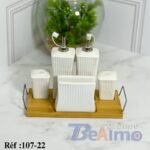 هذا الطقم الفاخر من Groupe BeAlmo يجمع بين العملية والأناقة ليضيف لمسة راقية إلى مائدتك. يتكون من ست قطع سيراميك بيضاء ذات تصميم مضلع أنيق، تشمل زجاجتين طويلتين مزودتين بفتحات معدنية لصب الزيت والخل بسهولة، بالإضافة إلى أوعية صغيرة مثالية للصلصات أو التوابل.