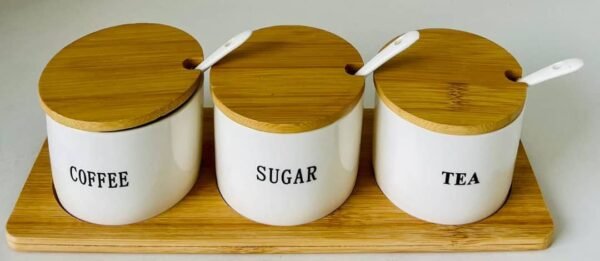 العلب تحمل نقوشًا واضحة باللون الأسود لتحديد الاستخدام: COFFEE، SUGAR، وTEA، مما يساعد على التنظيم ويضيف لمسة ديكورية جميلة. تأتي العلب مرتبة على قاعدة خشبية أنيقة تجعل الطقم متكاملًا وسهل النقل، كما تضفي لمسة طبيعية دافئة على التصميم.