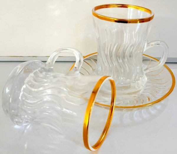 هذا الطقم المصمم بعناية يجمع بين البساطة والرفاهية ليمنحك تجربة ضيافة مميزة. يتكون من ستة فناجين زجاجية شفافة مزودة بمقابض مريحة، مع صحون مطابقة مزينة بحواف ذهبية تضفي لمسة فاخرة على كل قطعة. يتميز الزجاج بجودته العالية وشفافيته التي تبرز جمال المشروبات الساخنة، بينما تضيف الزخرفة الذهبية لمسة كلاسيكية أنيقة تجعل الطقم مناسبًا للاستخدام اليومي أو المناسبات الخاصة.