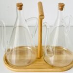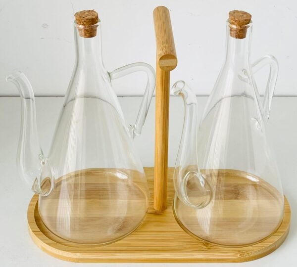 يتكون هذا الطقم من قارورتين زجاجيتين شفافتين بتصميم مخروطي أنيق، مزودتين بمقابض وصبّات مريحة لتقديم السوائل بدقة وسهولة. القاعدة الخشبية المتينة تحتوي على مقبض مركزي لتسهيل الحمل والتنقل، مما يجعله مثالياً لتقديم الزيت، الخل، أو الصلصات في المناسبات أو الاستخدام اليومي. يجمع بين العملية والجمال في تصميم عصري يناسب المطابخ والطاولات الراقية.