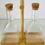 طقم فاخر يتكون من قارورتين زجاجيتين شفافتين بتصميم محفور جذاب وقاعدة خشبية أنيقة بمقبض عمودي. السدادات الفلّينية محكمة الإغلاق ومثبتة بأسلاك معدنية لضمان حفظ السوائل. مثالي لحفظ وتقديم الزيت، الخل، أو الصلصات بطريقة عملية وجمالية، ويضفي لمسة ريفية راقية على طاولة الطعام أو المطبخ.