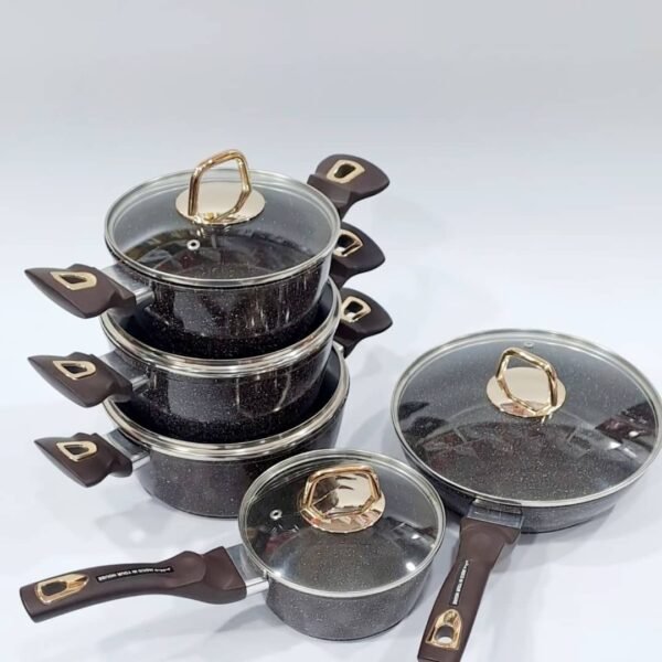 طقم الطهي المثالي لكل مطبخ عصري! يتكوّن من 6 قطع متعددة الأحجام، مصنوعة من مادة غير لاصقة عالية الجودة، تضمن طهي صحي بدون التصاق. كل قطعة مزوّدة بغطاء زجاجي شفاف بمقبض ذهبي أنيق، يتيح لك مراقبة الطعام أثناء الطهي. المقابض مصممة بشكل مريح بلون بني مع لمسة ذهبية تضيف فخامة وأناقة. الطقم يحمل توقيع IMPERIAL NON STICK COOKWARE، مما يضمن جودة عالية وأداء ممتاز. مثالي للطهاة المحترفين والمبتدئين، سواء للتحمير، السلق أو الطهي اليومي.