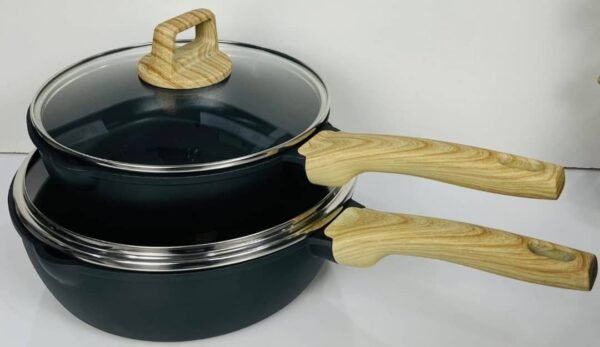 هذا الطقم العصري يجمع بين الأناقة والوظيفة العملية ليمنحك تجربة طهي مميزة. يتكون من مقليتين بأحجام مختلفة، مصنوعتين من خامة عالية الجودة مع طبقة غير لاصقة تسهل الطهي والتنظيف وتقلل الحاجة لاستخدام الزيوت. المقابض بتصميم خشبي أنيق توفر قبضة مريحة وآمنة، بينما الغطاء الزجاجي الشفاف المزود بمقبض خشبي يتيح لك متابعة عملية الطهي بسهولة دون رفع الغطاء.