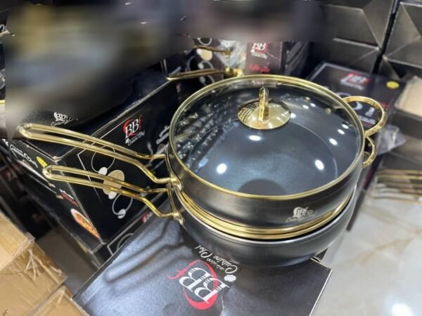 طقم الطهي الفاخر من BBF يجمع بين الشكل الراقي بالألوان الذهبية المميزة والجودة العالية في الطهي. مناسب لجميع أنواع المواقد، ويوفر توزيع حرارة ممتاز مع سهولة في التنظيف.