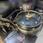 يأتي بتصميم أسود أنيق محاط بحواف ومقابض ذهبية تعطيه لمسة فخامة، مع غطاء زجاجي مقاوم للحرارة يسمح لكِ بمتابعة الطهي بكل سهولة.