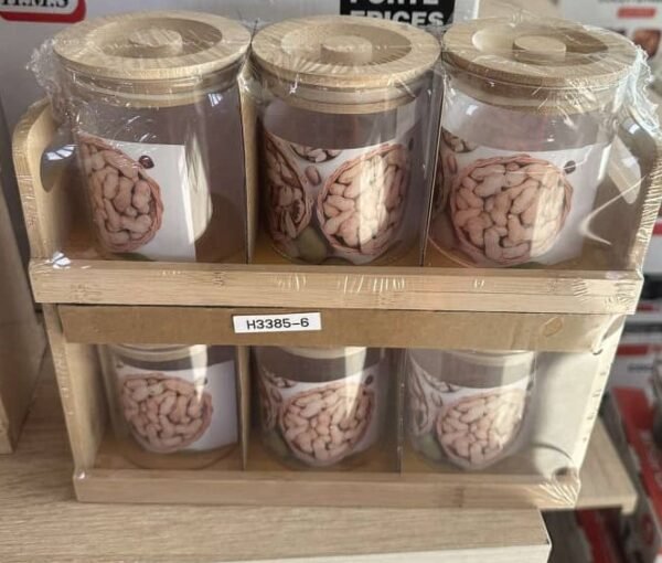 مرتبة على رف خشبي عملي، ومغلفة بشكل أنيق، هذا الطقم مثالي لحفظ المكسرات، التوابل، أو حتى الحبوب بطريقة منظمة وجذابة. مناسب للمطبخ العصري، ويشكل أيضاً فكرة رائعة كهدية منزلية.