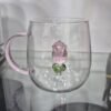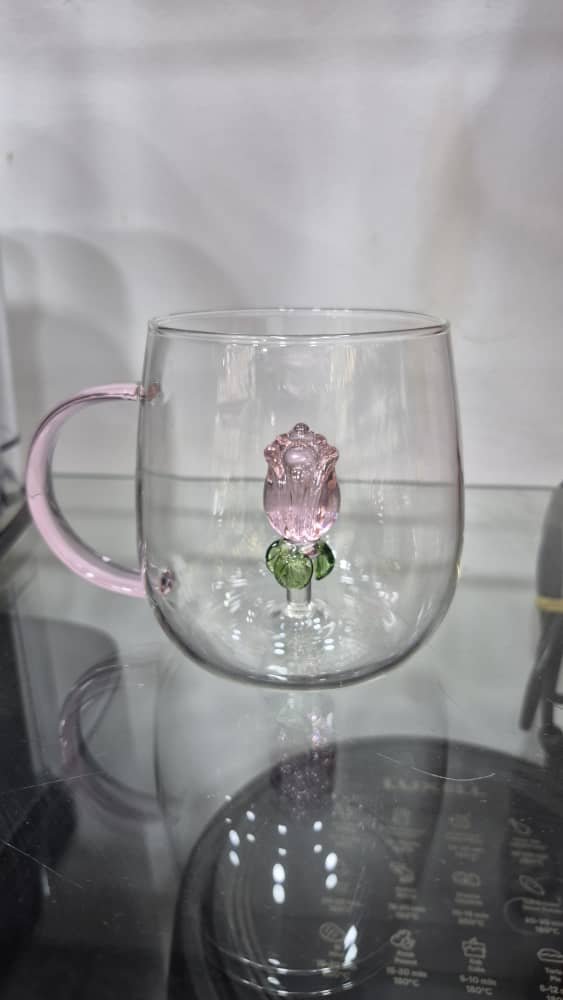 كوب زجاجي شفاف بمقبض وردي وقاعدة مزينة بوردة فنية، يجمع بين الأناقة والتميز.