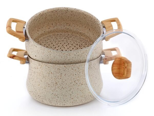 طاجين عملي وفخم بسعة 8 لتر، مثالي لتحضير كميات كبيرة من الوصفات التقليدية والعصرية. مصنوع من غرانيت مقاوم للالتصاق بلون أسود أنيق منقط، مع مقابض خشبية مريحة وغطاء زجاجي شفاف بحافة خشبية.