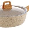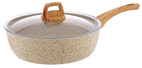 استمتعي بطهي عملي وأنيق مع هذه المقلاة الغرانيت غير اللاصقة، المصممة بلون أسود منقط جذاب ومزودة بغطاء زجاجي شفاف ومقبض خشبي مريح وآمن.