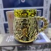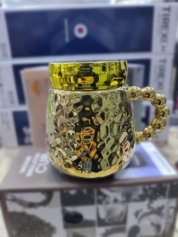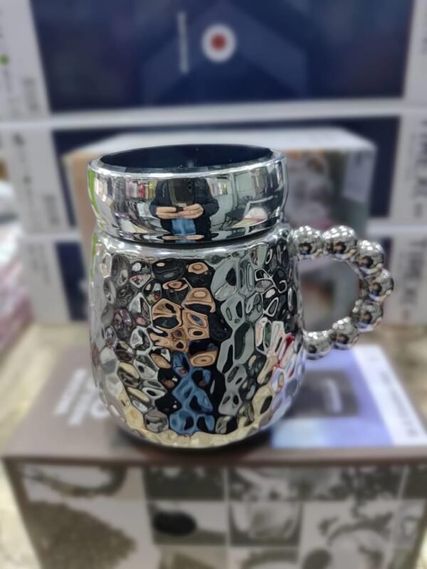 كوب بغطاء فاخر بتصميم فريد يجمع بين الأناقة والغرابة، يتميز بسطح عاكس عالي اللمعان يُظهر انعكاسات مشوهة للمحيط، مما يمنحه طابعاً فنياً مميزاً. سطحه الخارجي مزخرف بنقوش بارزة تضيف ملمساً جذاباً، بينما يأتي المقبض بتصميم مبتكر مكوّن من كرات معدنية متصلة، تضفي عليه لمسة عصرية غير تقليدية. يُعرض الكوب على صندوق ضمن بيئة عرض تجارية، مما يشير إلى كونه منتجاً راقياً يُستخدم كهدية أو قطعة ديكور فريدة لمحبي التصاميم الجريئة.