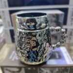 كوب بغطاء فاخر بتصميم فريد يجمع بين الأناقة والغرابة، يتميز بسطح عاكس عالي اللمعان يُظهر انعكاسات مشوهة للمحيط، مما يمنحه طابعاً فنياً مميزاً. سطحه الخارجي مزخرف بنقوش بارزة تضيف ملمساً جذاباً، بينما يأتي المقبض بتصميم مبتكر مكوّن من كرات معدنية متصلة، تضفي عليه لمسة عصرية غير تقليدية. يُعرض الكوب على صندوق ضمن بيئة عرض تجارية، مما يشير إلى كونه منتجاً راقياً يُستخدم كهدية أو قطعة ديكور فريدة لمحبي التصاميم الجريئة.