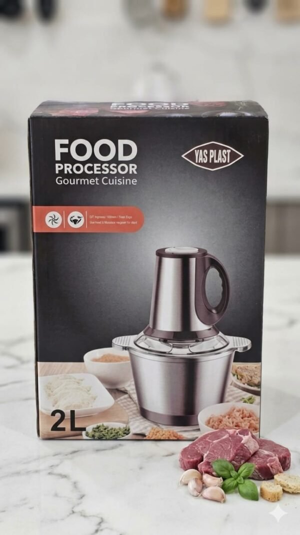 محضّر الطعام من YAS PLAST بسعة 2 لتر، مزود بمحرك عالي السرعة وشفرات ستانلس ستيل قوية لتقطيع وفرم وتحضير الطعام بسهولة.