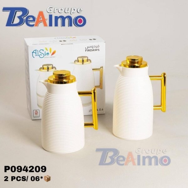 Alsie ثيرموس فردوس 1 لتر هو الخيار المثالي لكل من يبحث عن الجمع بين الأداء الرائع والتصميم الأنيق. تم تصميمه بلون أنيق يجمع بين الأبيض والذهبي، مما يجعله مناسبًا للاستخدام في الأماكن المختلفة سواء المنزل، المكتب أو أثناء السفر.