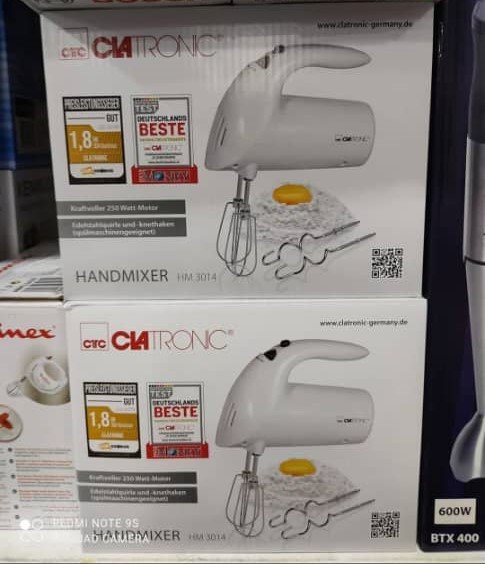 حضّري وصفاتك بكل سهولة مع الخلاط اليدوي Clatronic HM 3014، المصمم في ألمانيا ليمنحك أداءً قويًا وموثوقًا. مزود بمحرك بقوة 250 واط، و5 مستويات سرعة بالإضافة إلى وظيفة Turbo لنتائج أسرع وأكثر دقة.