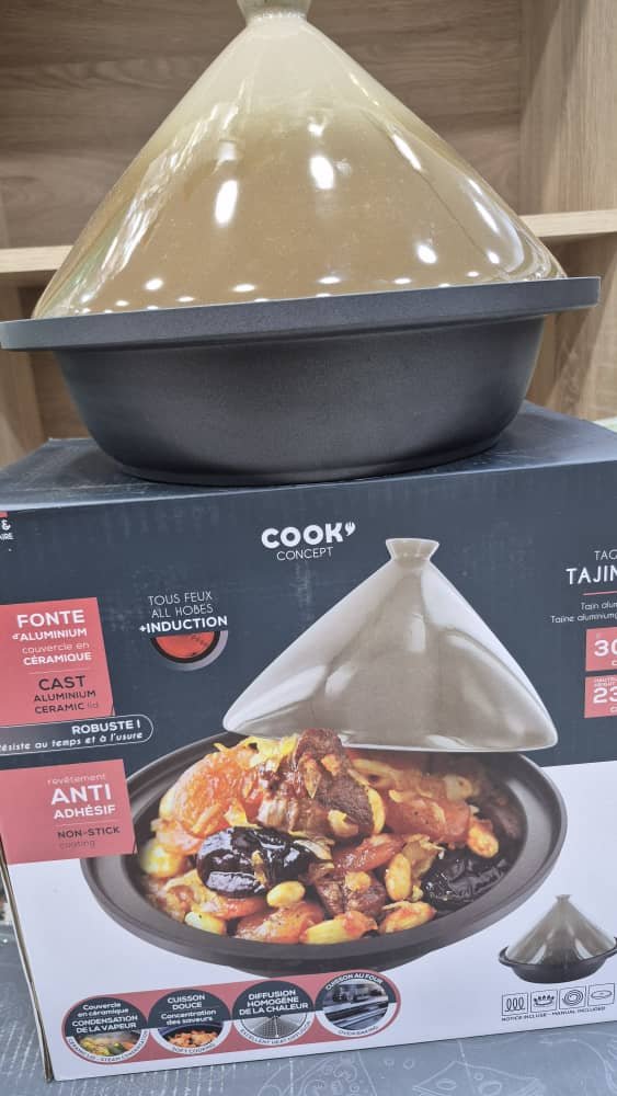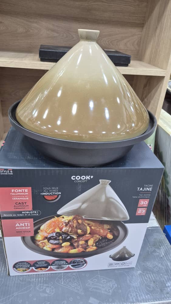 طاجين “Cook Concept” عالي الجودة يجمع بين التصميم التقليدي والأداء العصري، مثالي لتحضير أشهى الأطباق الشرقية والمغاربية. يأتي بغطاء خزفي مخروطي الشكل يحافظ على البخار والنكهات، وقاعدة مصنوعة من الألمنيوم المصبوب المقاوم للحرارة والتآكل. يتميز الطاجين بطلاء غير لاصق يسهل عملية الطهي والتنظيف، كما أنه مناسب لجميع أنواع المواقد بما فيها الحث الحراري (Induction). بقطر 30 سم وسعة 2.5 لتر، يوفر توزيعاً متجانساً للحرارة، مما يضمن طهيًا مثاليًا ولذيذًا. تصميمه الأنيق يجعله قطعة عملية وجذابة في المطبخ، سواء للاستخدام اليومي أو للمناسبات الخاصة.