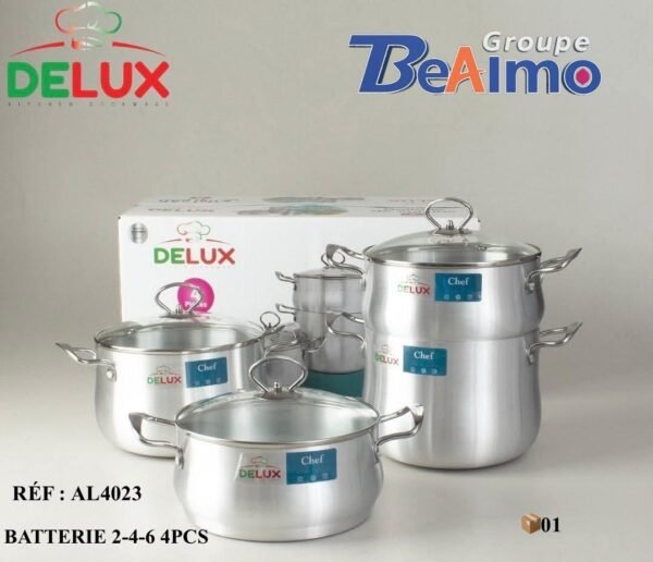 طقم الطناجر من خط Grand Chef Line من ماركة DELUX Kitchen Cookware يجمع بين الجودة العالية والتصميم العملي. مصنوع من الألمنيوم المصقول، ويحتوي على 3 طناجر بسعات مختلفة: P6,4P,3P لتلبية مختلف احتياجات الطهي من الشوربة إلى الطواجن.