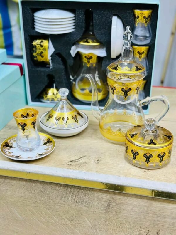 أضف لمسة من الفخامة إلى جلسات الشاي مع Sonashi Glass Tea Set، الطقم المصمم بعناية ليجمع بين الأناقة والوظائف العملية. يحتوي الطقم على إبريق زجاجي مزخرف، أربع كؤوس شاي صغيرة، سكرية بغطاء، قمع للتقديم، وستة صحون صغيرة بيضاء، جميعها مزينة بزخارف ذهبية سوداء أنيقة تعكس الطابع الشرقي الفاخر. سواء للاستخدام اليومي أو كهديّة راقية، هذا الطقم يمنحك تجربة شاي مميزة تجمع بين الأصالة والجمال.