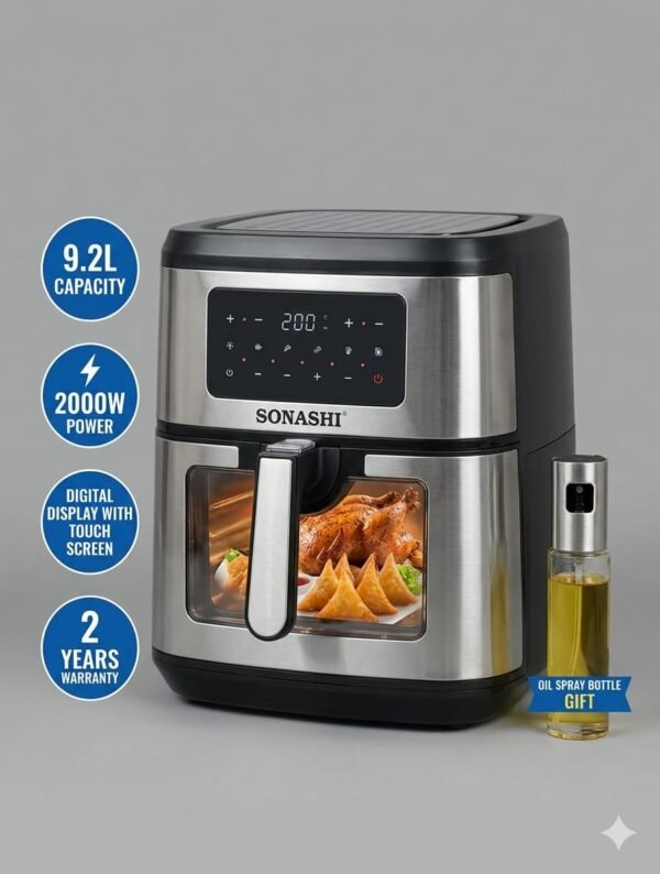 استمتع بوجبات صحية ولذيذة مع Sonashi Digital Air Fryer SAF-920، الجهاز العصري الذي يجمع بين السعة الكبيرة والتكنولوجيا الحديثة. بفضل سعته 9.2 لتر وتصميمه المبتكر بسلتين منفصلتين، يمكنك تحضير نوعين مختلفين من الطعام في نفس الوقت، بينما تمنحك شاشة اللمس الرقمية تحكمًا دقيقًا في الوقت ودرجة الحرارة. مع قدرة تشغيل قصوى 2000 واط، هذه المقلاة الهوائية توفر أداءً قويًا وسريعًا، وتأتي مع زجاجة رش الزيت كهدية لتجربة طهي أكثر صحة.